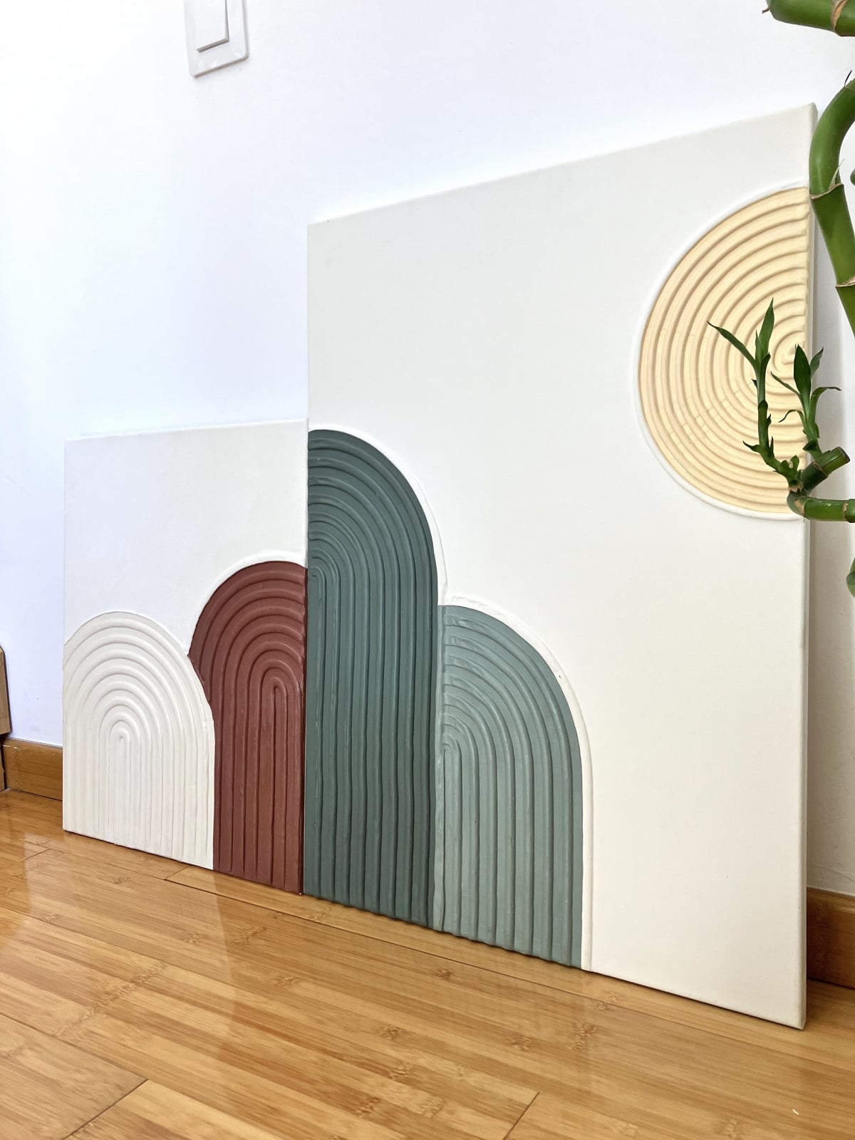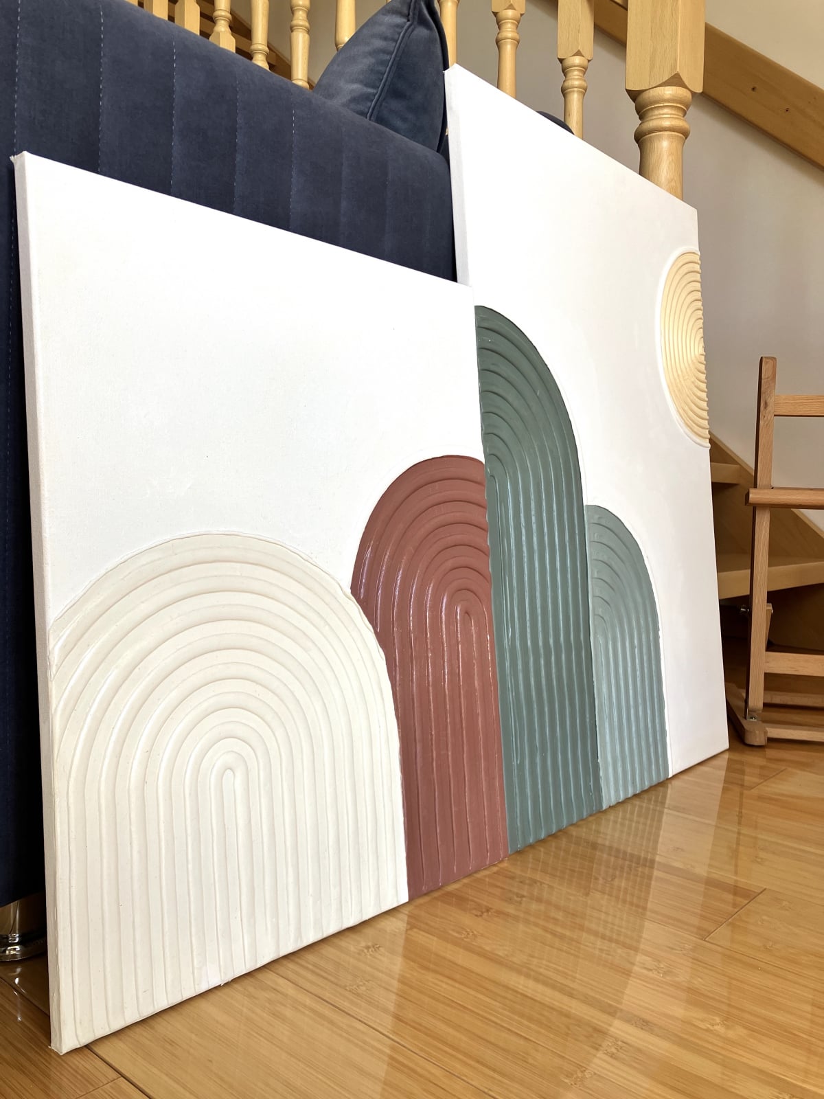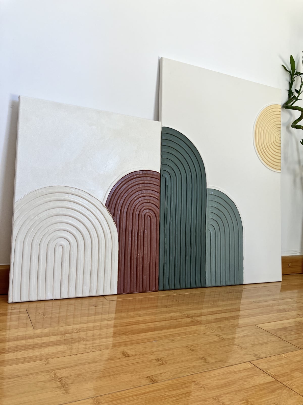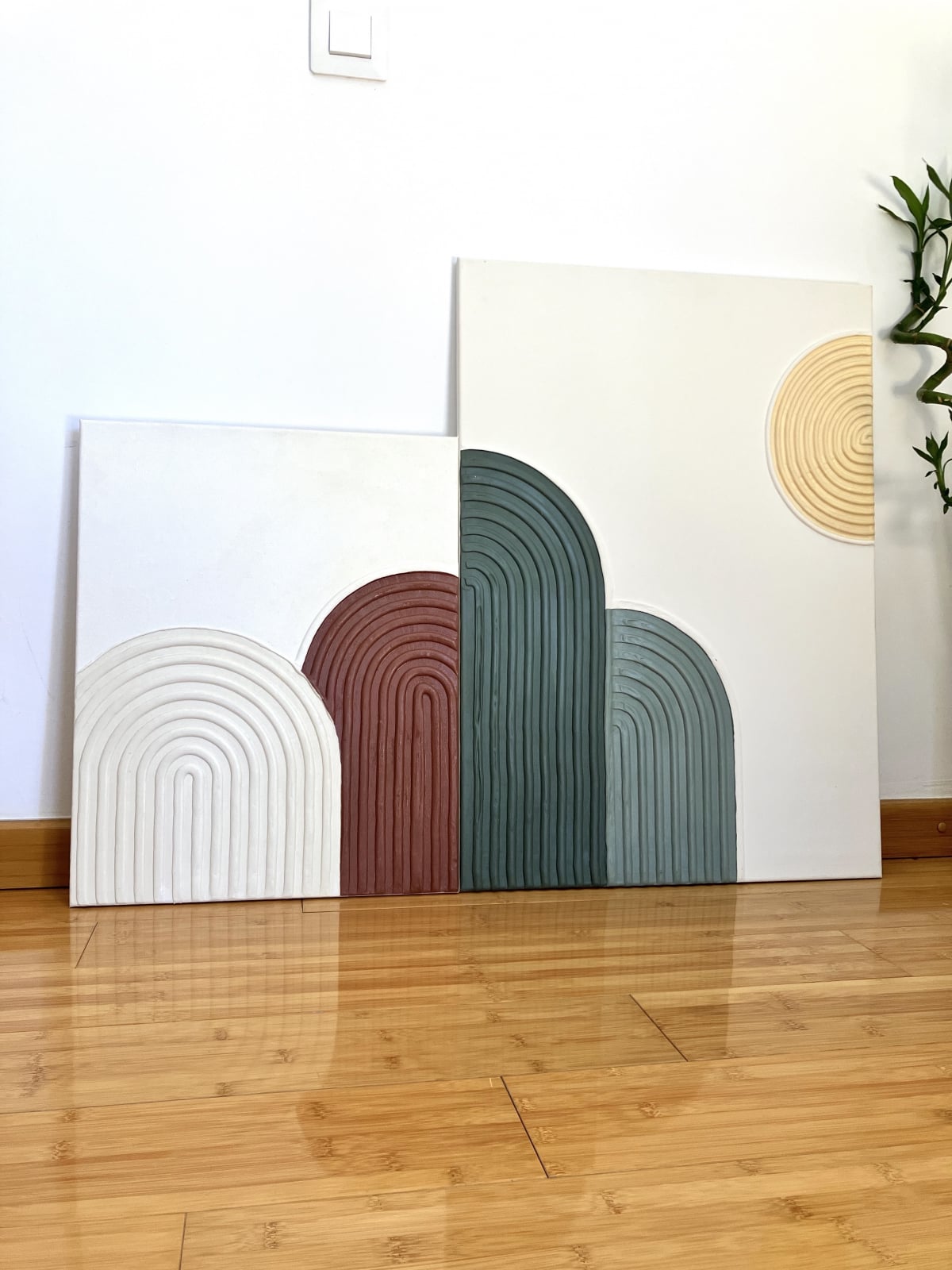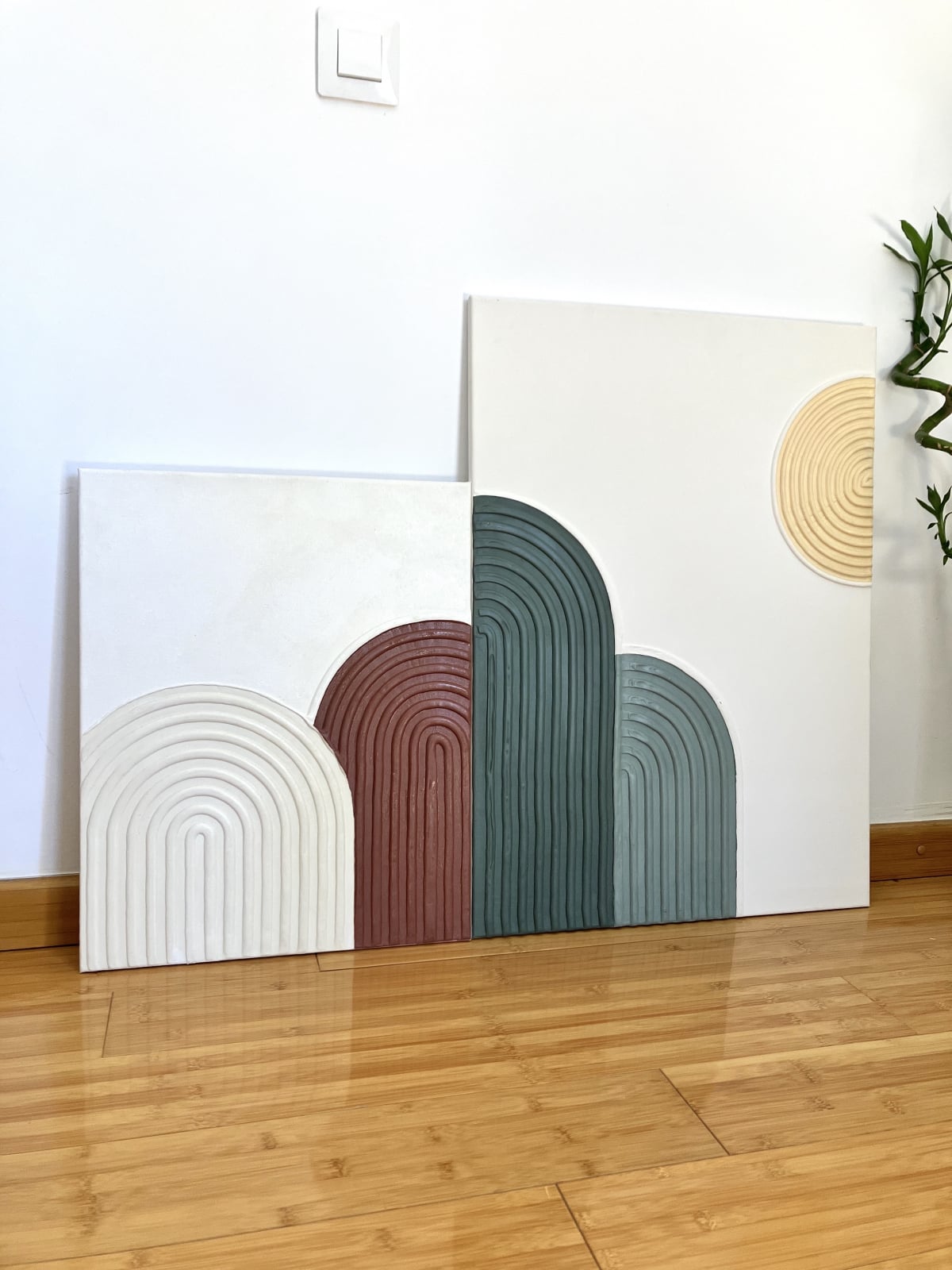 Tablouri texturate in relief, realizate din pasta si vopsea acrilica pe panza intinsa pe sasiu de lemn. Lucrate cu drag, uscate, slefuite, pictate si lacuite pentru o protectie indelungata.
